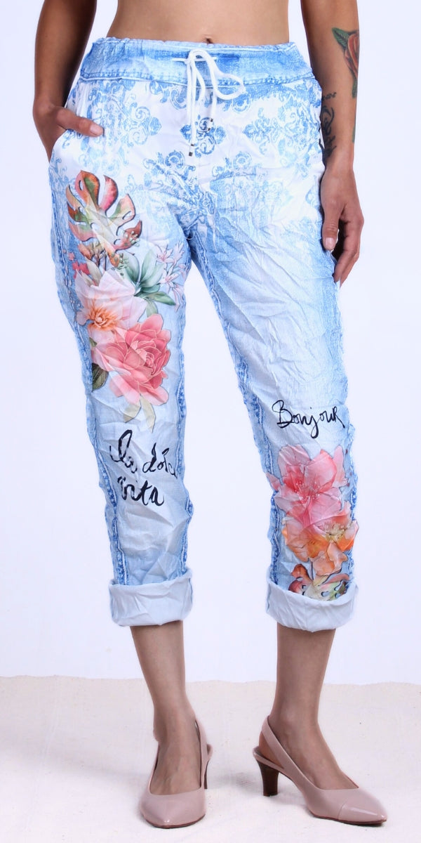The Geniviv Tropical Paisley Pant blends Italian ease with vibrant, mixed-print design. Featuring a comfortable drawstring waist, roomy pockets, and a relaxed jogger silhouette, this style pairs a faux-jeans base with colorful tropical florals and soft paisley accents near the waist. A bold, expressive piece that moves effortlessly from casual days to elevated evenings.