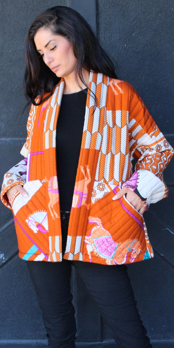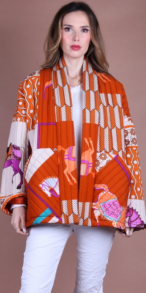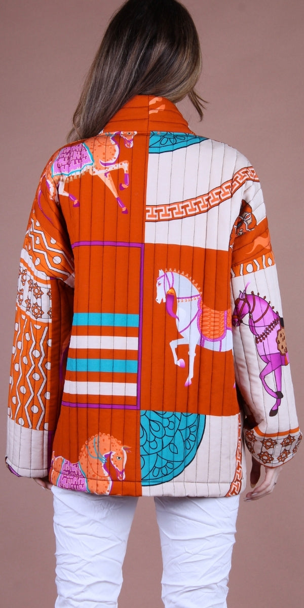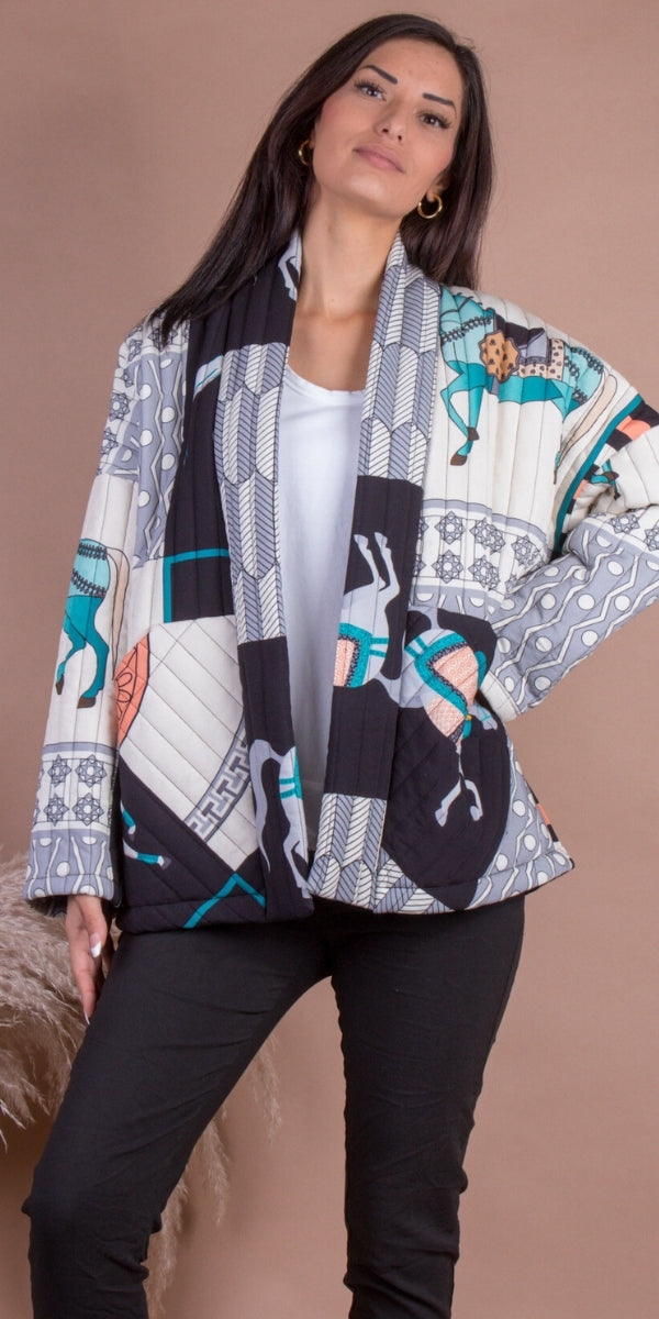 Quilted Kimono Style Jacket with Two Front Pockets. Vibrant Patchwork Design with Carousel Horses, Geometric Patterns, and Bold Stripes, Showcasing an Eclectic, Vintage-Inspired Style.