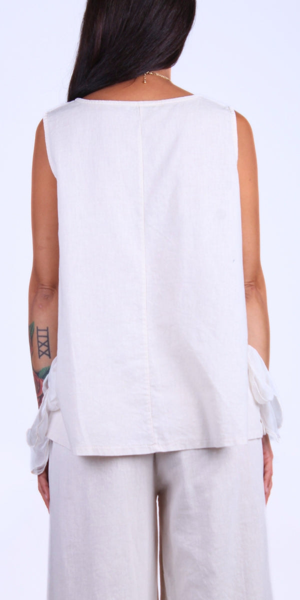 Sleeveless linen top — Relaxed, breezy silhouette with side slits and silk tie accents at the top of each slit for an elegant bow detail.