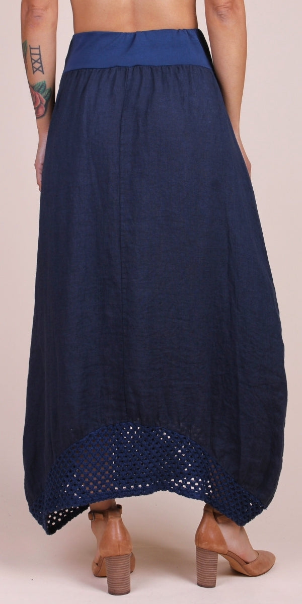 High-waisted linen maxi skirt — Jersey waistband and open-knit hemline. Front pockets with matching open-knit detail for effortless, polished styling.