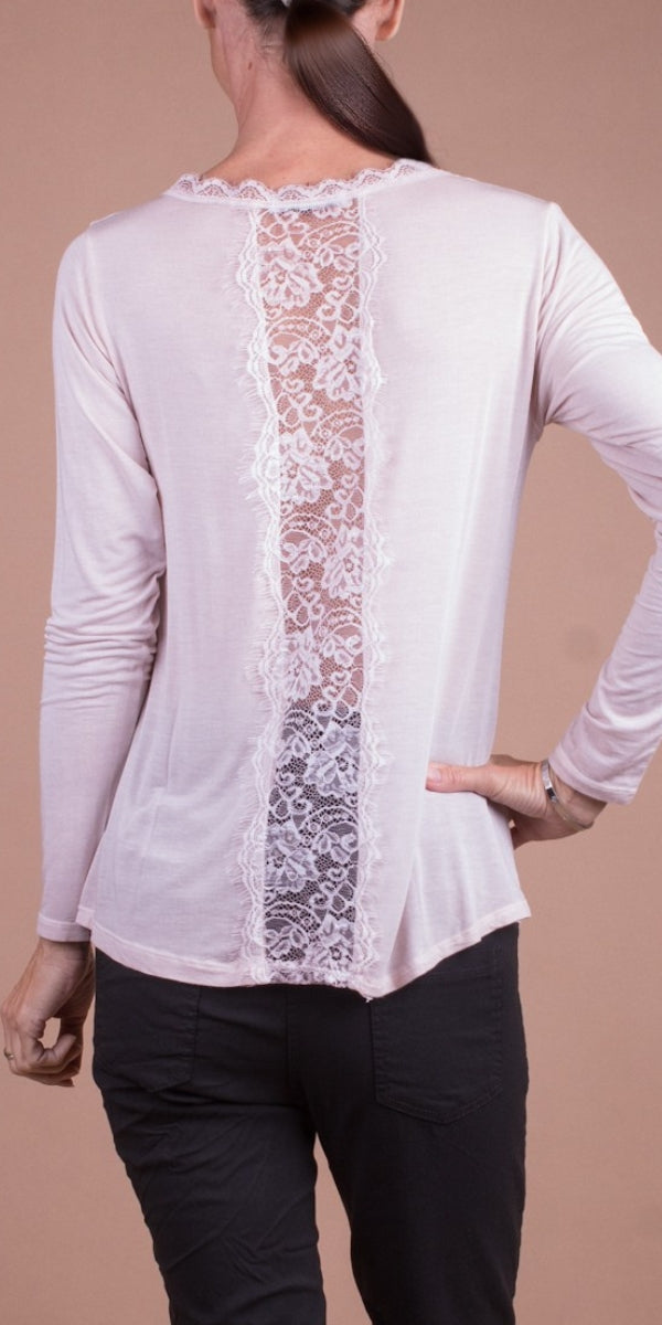 The Liano Lace Top blends Italian craftsmanship with refined elegance. A lace-trimmed neckline and sheer lace back panel create subtle yet striking detail, making it an effortlessly elevated layering piece.
