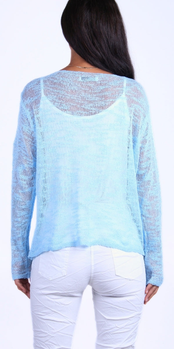 Airy Gauze Cardigan, Open Front with a Single-Button Neckline Closure.
