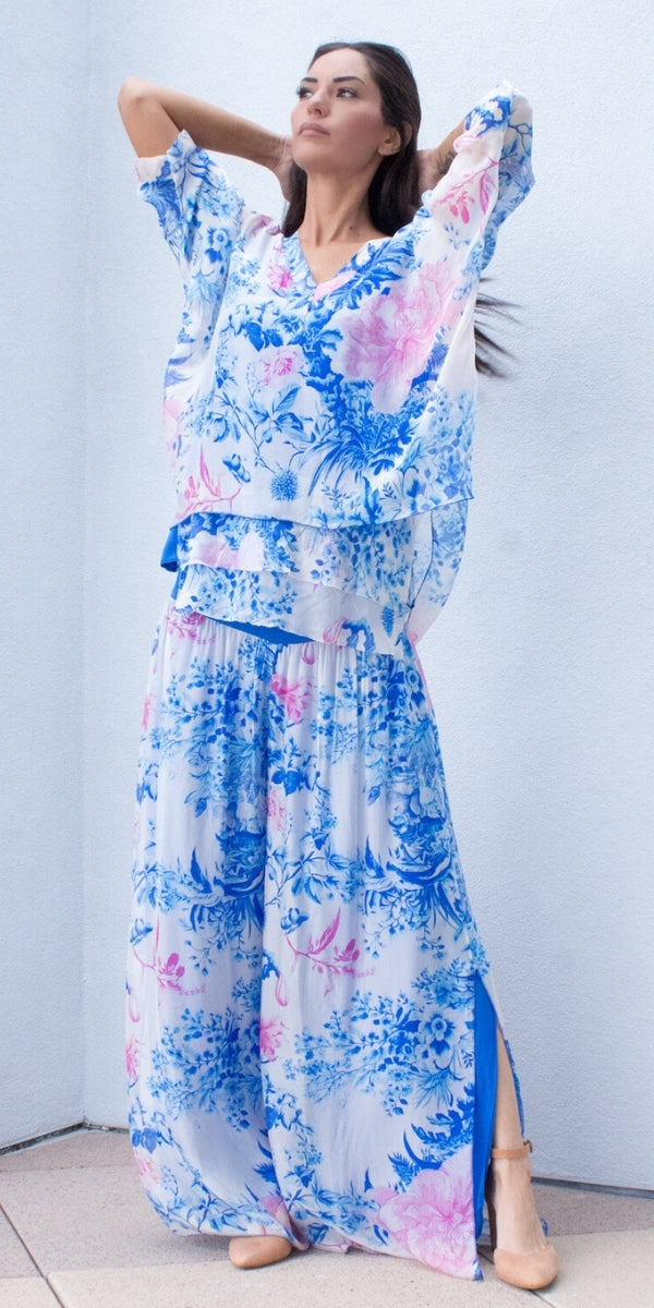 The Jasmin Peonia Slit Pant combines Italian elegance with modern detailing. Designed with an elastic waistband and side slit hem, these pants offer comfort and ease of movement. The vibrant royal-blue and pink garden print with peony flowers adds a playful, sophisticated touch. Perfect for pairing with the Diana Peonia Blouse or styling on their own for a standout look.